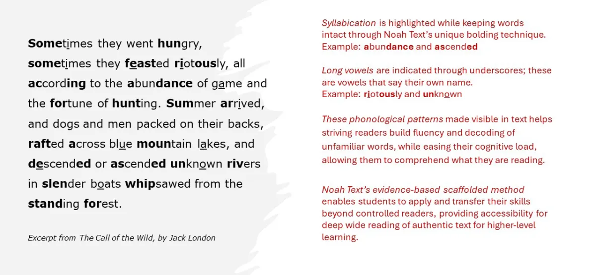 Noah Text’s easy-to-use scaffolded text shows readers the structure of words, resulting in